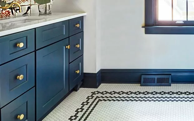 Because the house is a 1930’s tudor, we played homage to that by using a simple black and white hex pattern on the floor and retro style hardware that keep the whole space feeling vintage appropriate.